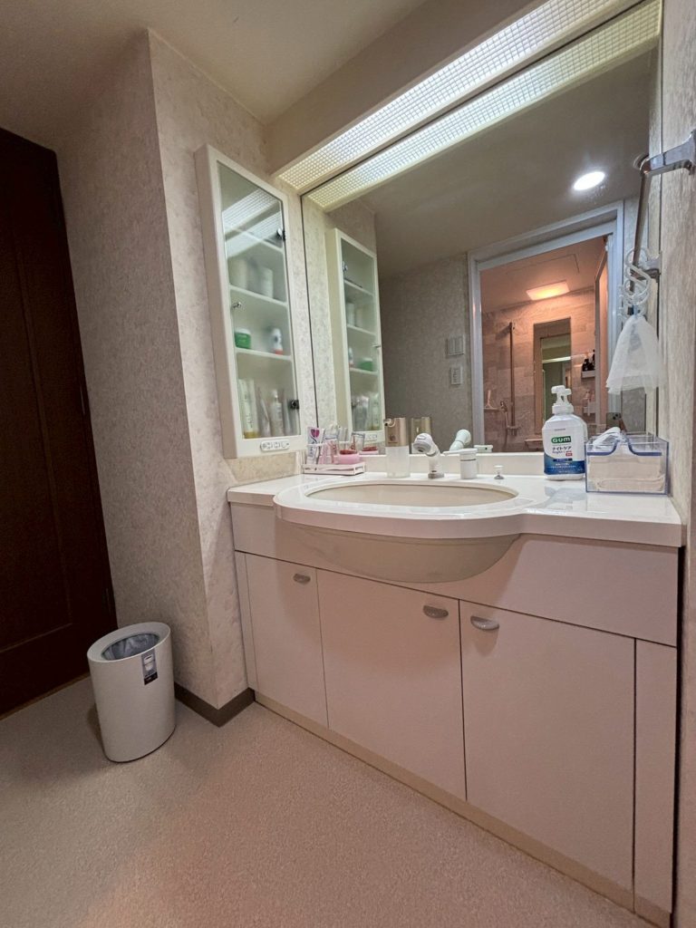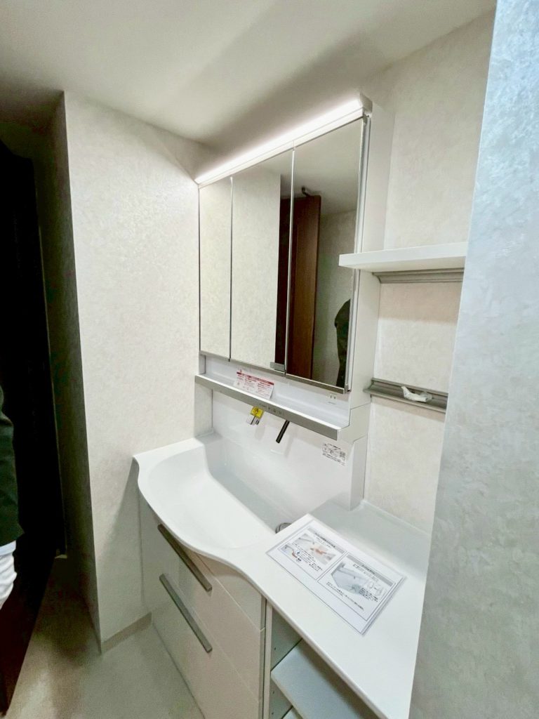 洗面化粧台は一面鏡から収納たっぷりの三面鏡へ。