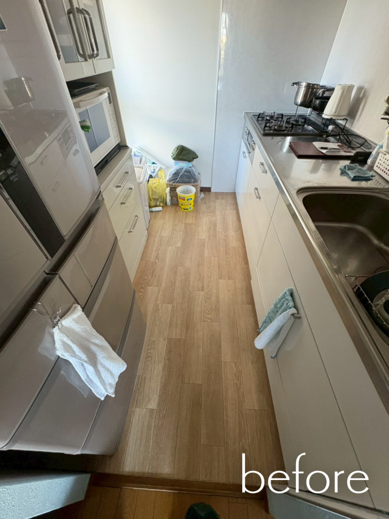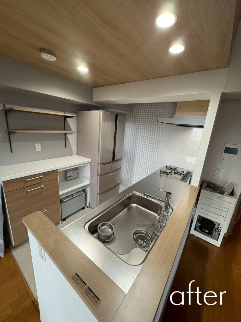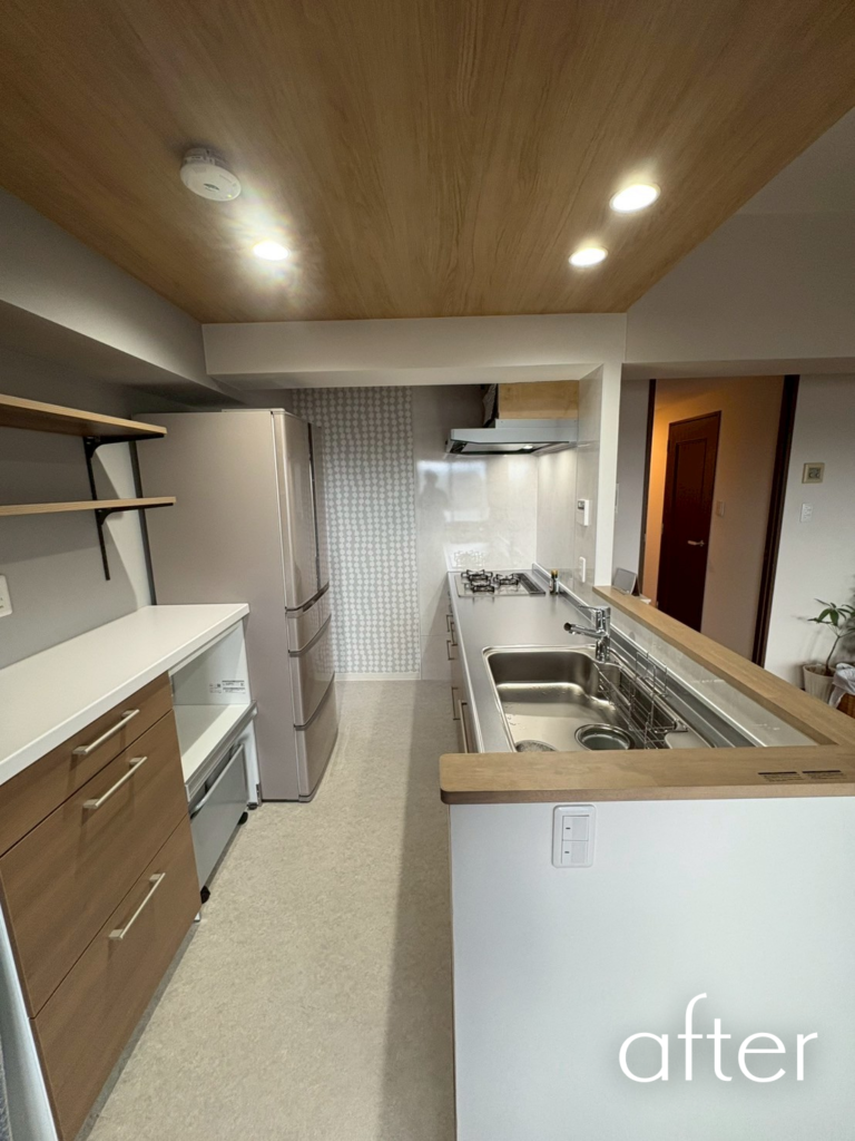 お施主様にご相談をいただき、間仕切り壁を撤去して広々としたキッチンに仕上がりました。