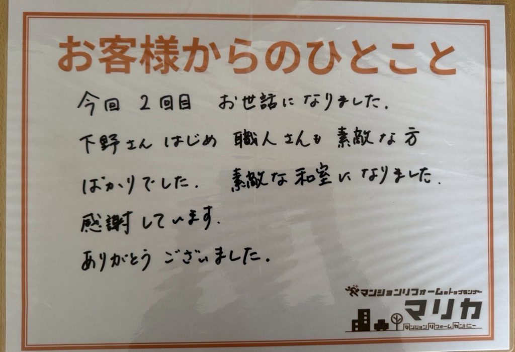 前回工事の水廻りの時から悩んでおられた和室の内装工事を年内に完成させられて私も嬉しく思います!素敵に仕上がった和室空間でゆっくりとお過ごし下さい。
