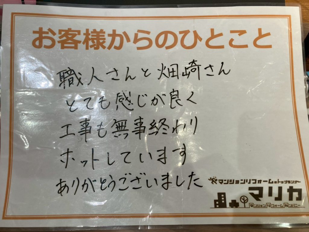 また工事中も職人さんへのお心遣い、ありがとうございました。